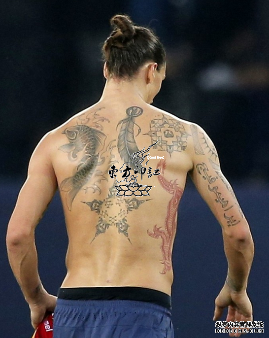 伊布对纹身艺术的痴迷,可以从其全身个性的纹身图案中看出来,虽然其没有耀眼的纹身花臂,但是伊布的后背纹身可谓十分抢镜,在后背上纹着一条大红龙纹身,一条锦鲤纹身,一个捕梦网纹身,还有两个类似图腾的纹身图案!