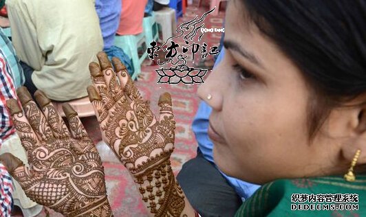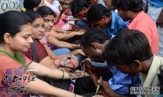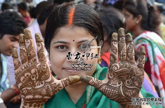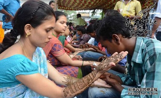 当地时间2014年8月27日,印度安拉阿巴德,当地女性在“提吉节”(Teej Festival)前夕在手部做海娜纹身(绘在皮肤上的装饰图案),以此方式来为自己的丈夫长寿祈福。这对于印度来讲,是一种传统纹身风俗,以祈福为主要需求的纹身,在很多原始部落中是非常常见的,其中以图腾纹身为主流纹身图案,像印第安一些原始部落中的图腾纹身是非常讲究的。本文中提到的海娜花纹身也是同样的一种非常具有地方特色的纹身习俗。这是一种以十分明显的方式来表达当地女性对于自己丈夫的爱,祈祷他们长寿。