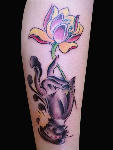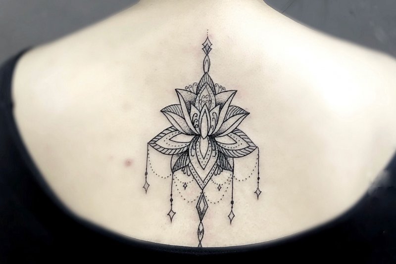 莲花是许多菩萨的底座,它的纯洁与正直使它拥有崇高的地位。经过线条和花纹勾勒的莲花图腾更显精致,下端挂着几颗星星,散发着神圣的光芒。