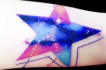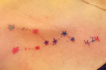 在锁骨部位纹上彩色的小星星图案,运用点刺的技巧将星星连起来,清新而又不会显累赘。