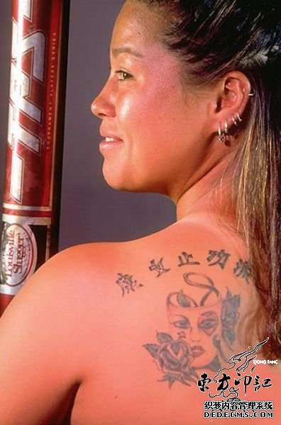 美国垒球女运动员金·马赫肩部有两处纹身,其一是一个类似面具的纹身图案,其二则是令人费解的汉字纹身,内容是“康文止功流”,即使是文言文,这样的纹身也难解其意呀,姐姐,这是神马意思啊?