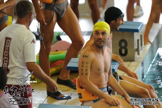 这同样是一位运动员,来自13/14年意甲比赛前夕的都灵队,这位纹身控同样纹着汉字纹身,“爱家命界,大力志勇”,就算是对联,也不对称呀。这是要引导新的纹身时尚吗?费解!