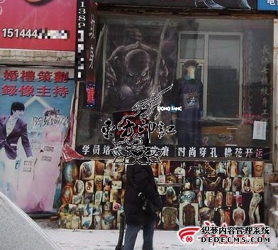 在商铺林立的大街上,如何才能吸引人呢?劲爆的音乐、漂亮的门面,还是热闹的剪彩,这些貌似都已经OUT啦!最厉害的商店或许是“无声胜有声”的宣传吧,最近的一家纹身店在网上异常火爆,其火爆的原因并不是因为这家纹身店的纹身有多厉害,而是因为其门面造型十分给力,在纹身店的橱窗内摆放“僵尸”模特,如此另类的招牌让这家纹身店顿时“鬼”气十足。