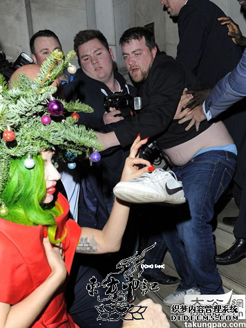 在如今已经12月份的国外,应该是一片喜庆与热闹吧,因为一年一度的圣诞节马上就要到了,在这个盛大的节日里,如果没有一点欢庆的气氛,怎么叫过节呢,于是乎,ladygaga的新造型横空出世了,只见:一身红色个性连体裙,胳膊上和大腿上的纹身图案清晰可见,一头绿色长发,更拉风的是其头上戴着一个圣诞树的发饰,圣诞树上还挂满了彩色小球,浓妆艳抹的ladygaga很开心地做着各种夸张的表情,并大方地与粉丝们拥抱合照,如此神一般的降临,委实让现场的摄影师们惊慌了,拍地不可开交,更逗趣的是,其中有一位狂热摄影师的鞋子被挤掉了,而LadyGaga不改搞怪本色,“优雅”的提起掉落的鞋子,送给了这位摄影师。