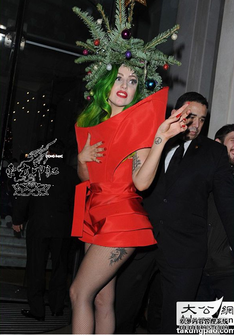 LadyGaga节日造型:绿发戴圣诞树秀纹身