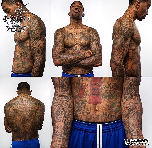 在这位人高马大的JR·史密斯身上有着无数个纹身图案,几乎包裹了他的全身,其纹身壮举在遍地都是纹身狂的美国NBA应该可以脱颖而出吧。健硕的胸部纹着两个十分明显的头像纹身,并且是一男一女对称分布,想必这两个人是JR·史密斯心中最为重要的两个吧,而在胸部下面则是飞人乔丹的形象纹身,虽然这位篮球运动员有点痞子气质的,但是其篮球技术还算是可圈可点的。另外,在其肌肉发达的右胳膊上还纹着一个身穿23号球衣的篮球运动员,貌似也是飞人乔丹的纹身图案。除了胸部有两个对称的纹身图案外,JR·史密斯的左右胳膊上也对称纹着一对合掌祈祷的双手。看来这位西方大个子还是很有审美修养的呀!