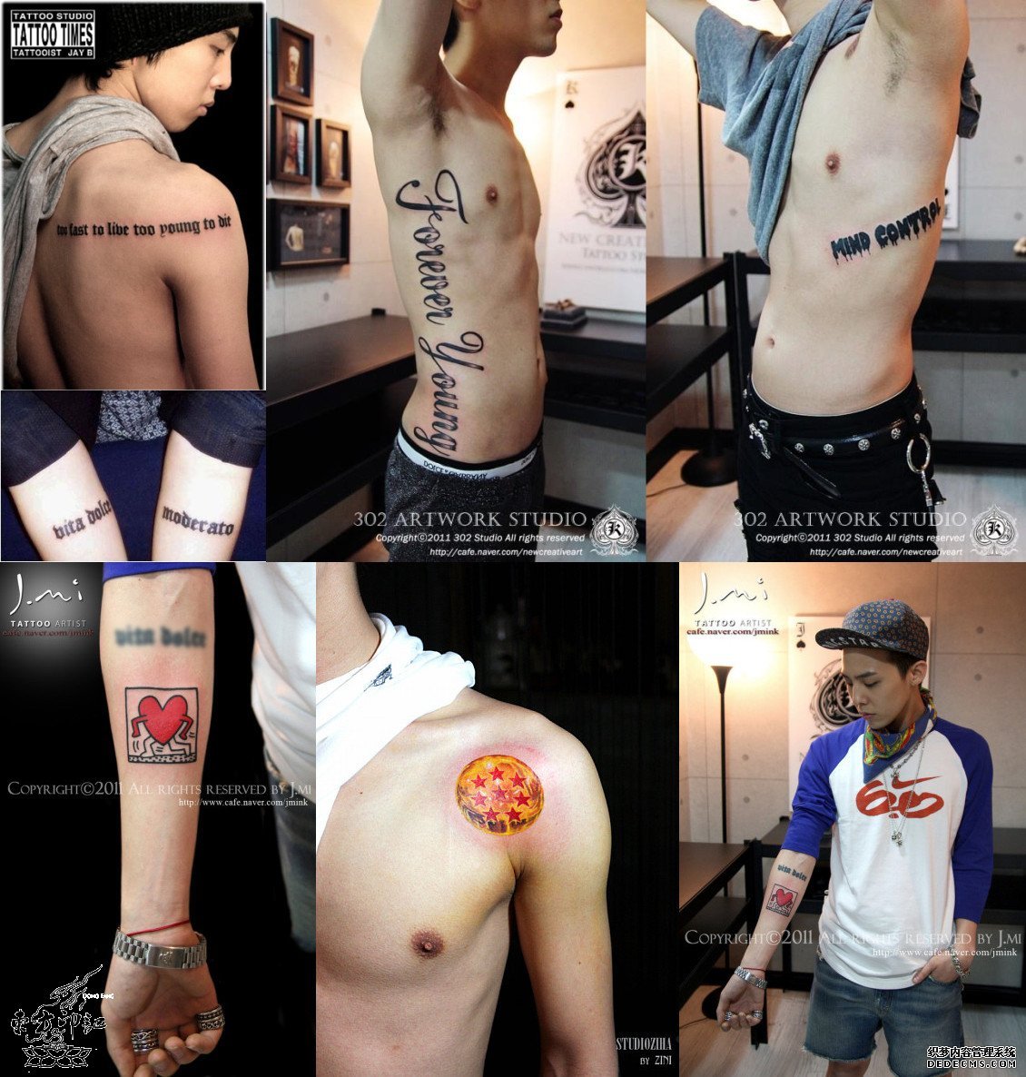 这位被韩国媒体称为是“话题制造机”、“时尚潮流引导者”的权志龙确实是一位名副其实的潮人,不管是从发型,着装,音乐,还是纹身,权志龙一直都是韩国娱乐媒体关注的焦点,而这次新添的嘴唇纹身是一个阿拉伯文字,翻译过来是“rise”的意思,而其最新专辑的名字正是这个,可见,其新的纹身是在为其新专辑热身宣传啊!据不完全统计,权志龙全身纹身已经高达10个左右,在诸多的纹身图案中,权志龙貌似很喜欢文字纹身,肩膀上,肚皮上,手腕上,手指上,权志龙是真真正正将皮肤当做写字板了呀,不管是英文的还是意大利文的,不管是纹身字体还是纹身含义,权志龙的文字纹身委实也是一种艺术。而最逗趣的一个纹身图案是位于其耳朵后面的一个按钮纹身图案,这个纹身图案上纹着“ON”和“OFF”字样,只可惜,如此逗趣的一个按钮纹身,是处于“OFF”的状态,估计是不想被他人启动了吧。