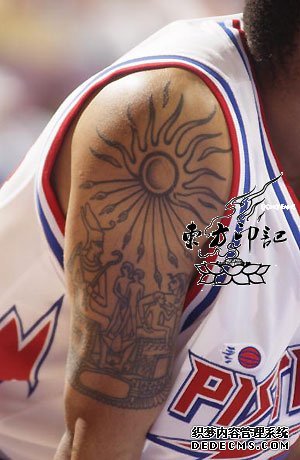 在这位长相憨厚的华莱士的右胳膊上有一处明显的纹身图案,图案的内容是这样的:图案上方是一个散发出耀眼光芒的太阳,下方则有一对父母和三个孩子。当然,这样的纹身图案不是小孩的信手涂鸦,而是一个颇有文化气息的纹身图案。据纹身师介绍,这个纹身图案中的人物分别代表国王、王后和孩子,是一个具有埃及文化传统的经典标志。华莱士之所以纹这样的纹身图案,是因为他本人对于古埃及文化极为推崇,于是华莱士颇为得意地选择了这一纹身,并在耐克的广告宣传片中时,还有意无意地亮出了纹身图案。然而,晒纹身不要紧,却晒出了一场麻烦。 一位名为麦特鲁·雷德的艺人认为,虽然纹身图案出现在华莱士的身上,但该图案的版权应当属于创造者自己而非华莱士这个使用者。因此当这一纹身图案出现在商业广告中时,也就侵犯到了他的纹身图案的版权。这样的叫板很是让人哭笑不得,因为明星撞衫的年年都有,纹一个相同的纹身图案更是很正常并且自然的事情,可是这位纹身创作者很有版权意识,随即向法院提起诉讼,要求华莱士为侵犯纹身版权的行为支付赔偿。结果法院支持了他的观点,判决华莱士必须为非法使用这一纹身支付450美元。当然,对于年收入超过千万美元的华莱士来说,这点赔偿只能算是九牛一毛。不过这起官司还是给所有热爱纹身的NBA球员敲响了警钟,提醒他们必须以更慎重的方式来展示纹身。