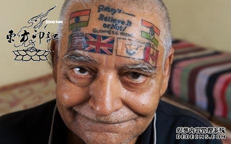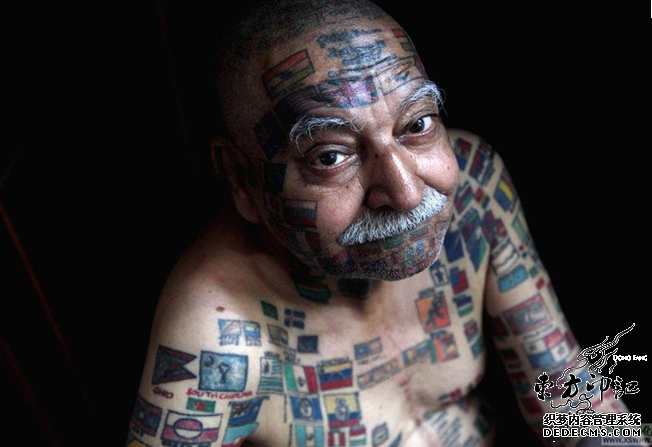 这位在全身纹满世界各地国旗纹身的男子来自印度,并且是一位70岁左右的老人,年轻人的纹身图案大概只局限于名言警句,爱情箴言了吧,因此这位名叫har parkash的老人的纹身显得十分珍贵和罕见,目前他已经在脸上纹了6种旗帜图案,包括加拿大、英国、印度、美国和塞浦路斯的国旗以及印度国大党党旗。并在3年的时间里,从脖子往下,按照字母顺序纹下了其他国家的国旗纹身,并且还打算在头上纹上多达60面旗帜的纹身图案,