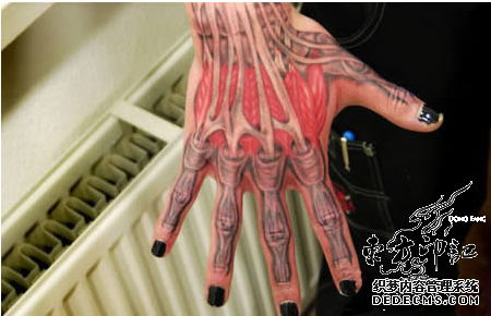 虽然死尸也是人类存在的一种,但是却很少有人敢于欣然面对,这样的胆怯,让人类的勇敢形象委实大打折扣。然而对于艺术家来说,死亡永远是一个“取之不尽,用之不竭”的创作题材,这一点对于纹身艺术家来说——同样!当然,纹身艺术家笔下的死亡题材绝不仅仅是一具死尸,而是比死尸更彻底的骷髅纹身抑或血腥的肌肉组织——解剖纹身。