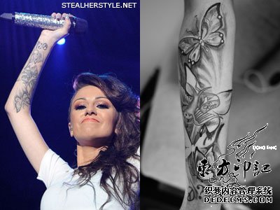 蝴蝶纹身——这些蝴蝶纹身图案遍布雪儿的右前臂,漂亮的黑灰风格纹身将其右臂装点成了一个漂亮的花臂,而纹上蝴蝶图案,也只是因为雪儿喜欢蝴蝶。