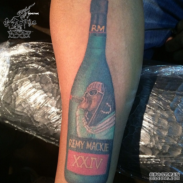 Papoose最近在Instagram上分享了一张肖像纹身照片,这个纹身中的肖像是其爱妻Remy Ma,而这个纹身是由黑灰纹身大师Kelvin Cepeda创作完成的,在这个纹身图案中,一个人头马的酒瓶上,印着Remy Ma金发碧眼,手持麦克风的肖像纹身,而在这个肖像纹身下面,还纹着"REMY MACKIE"类似标签的字样纹身,而这个名字纹身中的“MACKIE”正是Papoose的姓氏。