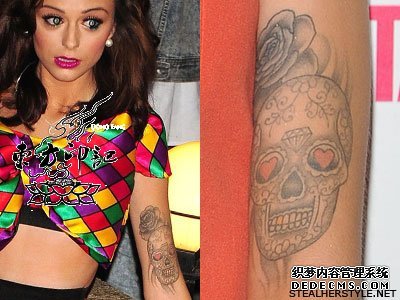 骷髅纹身——这个纹身位于雪儿的左胳膊上臂,是由一个骷髅图案和一个玫瑰图案构成的,在这个骷髅纹身中可以看到,骷髅的眼睛中间是一颗钻石,而其两只眼睛则是两颗大大的红心,牙齿被纹成了金色,总之这个骷髅纹身是一个有钱的象征。