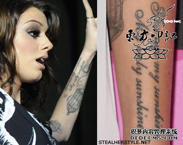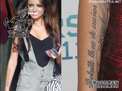 献给母亲的纹身——在雪儿的右胳膊外侧有一句英文纹身,纹身内容为“All that you have is your soul ”,这句英文摘自其母亲最爱的一首歌曲,在参加完《英国偶像》的比赛后,雪儿特地跑去做这个纹身来献给母亲,由于纹身长度的限制,这句纹身被纹在了左胳膊外侧。