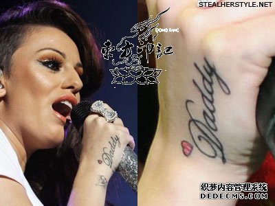 手上的各种纹身——在雪儿的手指上,有红心纹身,钻石纹身,蝴蝶结纹身(后腰上也有一个这样的纹身),音乐符号纹身,“daddy”纹身,和模仿蕾哈娜的‘shh...’纹身。