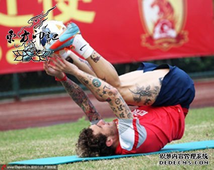 这次广州恒大公开训练课,的确吸引了许多球迷前来观看助威,有爱的恒大俱乐部还为到场助威的球迷们准备了免费的矿泉水。如此贴心的东家,看来迪亚曼蒂是找对地方了。迪亚曼蒂有一位台湾籍的老婆,两人相识也是因为足球,这位台湾女婿深得中国丈母娘的喜欢,为了表达对中国传统文化的喜爱,迪亚曼蒂还将自己的中国生肖猪的汉字纹在了身上,只可惜其身上的纹身图案太多太小,如果不仔细看,很难找到这个汉字纹身的踪影,除了纹汉字纹身外,身为人夫人父的迪亚曼蒂还将爱妻和孩子的名字也纹在了身上。