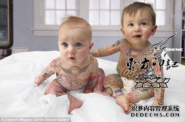 这位给宝宝纹身的艺术家名叫迪特里希·韦格纳,他为宝宝纹身并非是用常规的纹身方式,而是使用图片编辑软件。首先他给宝宝们拍摄照片,照片中的宝宝赤裸着小身子,呆萌的望着镜头,照片拍摄结束后,迪特里希便开始用图片编辑软件给宝宝们“纹身”了,他将各种各样的品牌logo用这个特殊的软件加载到宝宝光秃秃的身上,高超的软件编辑技术,使得品牌logo看起来就像是真的纹身一样。