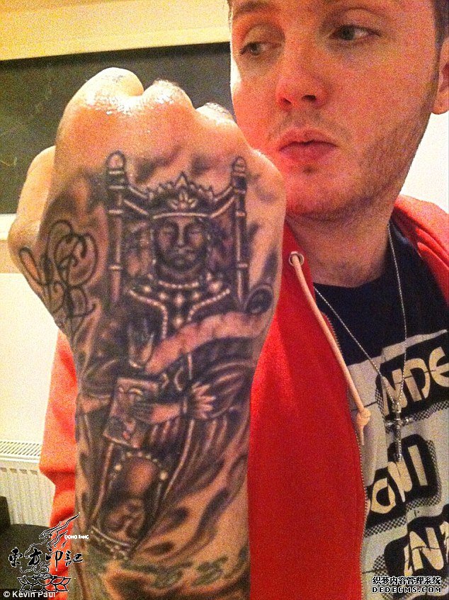 英国有一位闻名于世的纹身大师,他的名字叫凯文-保罗,而詹姆斯亚瑟身上的纹身则大多出自这位纹身大师之手,詹姆斯最新的一个纹身图案是位于其左胳膊上的蜡烛纹身,这个纹身图案是一支正在燃烧的蜡烛,蜡烛在国人的文化概念里是“照亮别人,燃烧自己”的意思,而詹姆斯-亚瑟的这处纹身是什么含义呢,尚未曝光。据了解,整个蜡烛图案由知名纹身师凯文•保罗制作,两人合作已长达一年多。2013年年初,凯文在詹姆斯的手上纹上了亚瑟王的形象,并将英国女王纹在另一面。