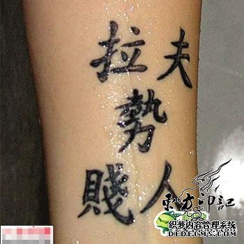 之前,就有新闻报道,有一位泰国纹身师因为不懂汉字给纹身顾客随意乱纹,最后被顾客起诉逮捕。由此可见,了解汉字并非易事。然而,在纹身艺术十分流行的国外,汉字纹身正在成为一种新的流行趋势,而真正了解中国文化和汉字文化的纹身师貌似很少,于是便出现了各种逗笑离奇的汉字纹身作品。之前有一位老外美女在胳膊上纹上了自己的中国生肖鸡,并且还选用了中国的繁体字来纹这个鸡字,虽然这个汉字纹身纹的很霸气,很端正,但是这位美女不知道,这个汉字在中国还有另外一个意思。除了这种汉字纹身外,还有国外的纹身者将汉字纹的不伦不类,几个毫不相干的汉字拼凑在一块,便组成了一个汉字纹身作品,例如:拉夫势贱人,老彼了我孩等等,这样的汉字纹身不要说老外不懂,就是精通汉语的国人也很不解吧!