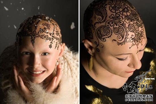 据纹身爱好者透露,在加拿大多伦多,有一个专门为癌症患者们创办的“纹身工作室”,在这里,从事纹身的纹身师们所接待的正是那些因为癌症而导致秃头的女性患者们,为了帮助这些癌症患者们重新找到美丽,重塑生活的希望,这里的纹身师们选择了彩绘纹身。他们从指甲花植物中提取天然颜料,模仿印度曼海蒂的手法在患者头上画上了精致繁复的图案。