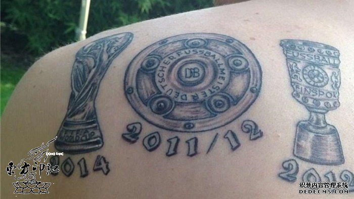据纹身爱好者透露,这位目前效力于德甲多特蒙德俱乐部的德国球员于今年夏天跟随德国队获得了世界杯冠军,为了表示庆祝(虽然有点过时了),这位球员在自己的后背上纹上了这个大力神杯纹身图案,除此之外,还将2011-12赛季德甲冠军奖盘和2012德国杯冠军两个奖杯一起纹了下来。