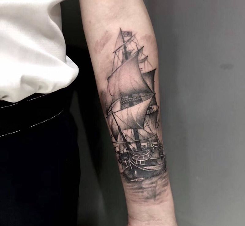 扬帆起航纹身图片_成品手臂欧美写实帆船纹身图案
