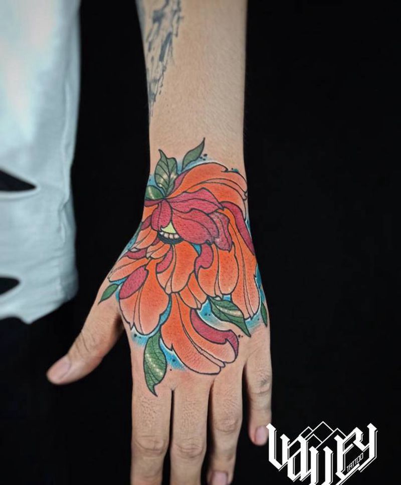 彩色花朵纹身图片_成品腿部清新写实植物纹身图案